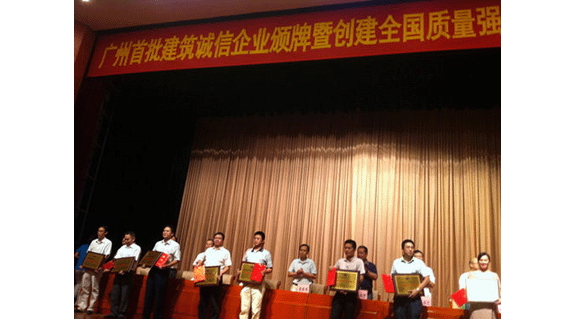 2013年9月11日上午,廣州市建筑業(yè)聯(lián)合會組織召開了“廣州市‘首批建筑業(yè)誠信企業(yè)’頒牌暨創(chuàng)建全國質(zhì)量強(qiáng)市示范城市報(bào)告大會”,邵云平會長、市城鄉(xiāng)建委李希平副巡視員、建筑業(yè)聯(lián)合會副會長及廣州地區(qū)相關(guān)獲獎(jiǎng)建筑企業(yè)領(lǐng)導(dǎo)、項(xiàng)目經(jīng)理、質(zhì)量、技術(shù)管理負(fù)責(zé)人、施工技術(shù)人員等600余人參加大會,會議表彰了我市首批33家建筑業(yè)誠信企業(yè)。總包公司作為 “廣州市建筑業(yè)誠信企業(yè)”達(dá)標(biāo)企業(yè)之一,曾國勝副總經(jīng)理代表公司上臺領(lǐng)了獎(jiǎng)。