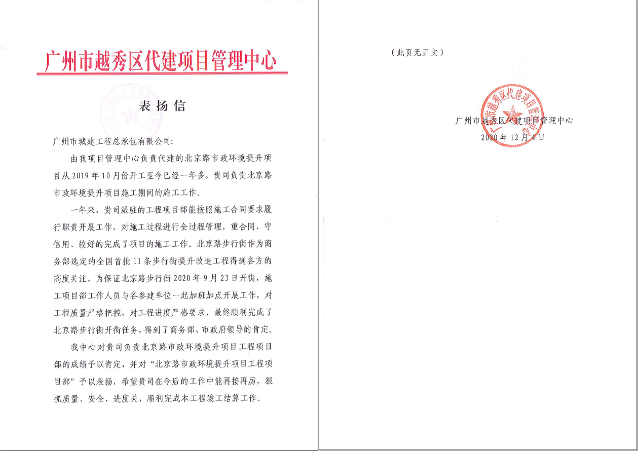 12月7日,廣州市越秀區(qū)代建項目管理中心向我公司發(fā)來表揚(yáng)信,對我公司負(fù)責(zé)的北京路步行街改造提升項目的施工工作予以肯定和表揚(yáng)。