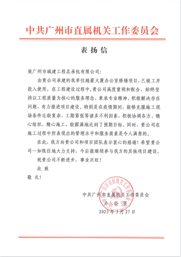 近日,中共廣州市直屬機關工作委員會向公司發來感謝信,為公司在克服施工條件復雜、工期緊張的情況下,順利完成市直機關辦公場所修繕項目表示肯定,并對公司及項目團隊表示衷心的感謝。